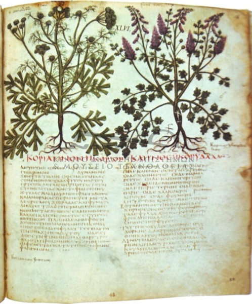 Ομοιοπαθητικά φάρμακα. Κόλιανδρος και καπνός-χόρτο, από τον Διοσκουρίδη. Νεάπολη, Εθνική Βιβλιοθήκη.